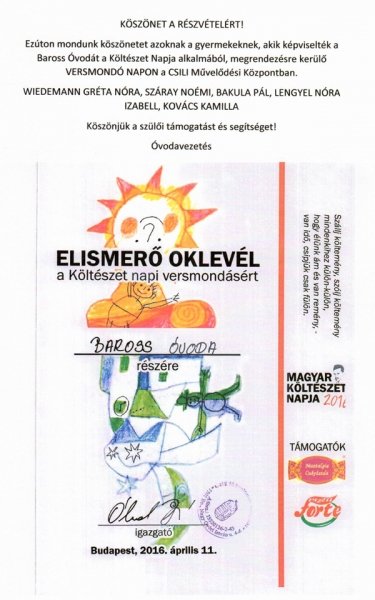 Rózsa Ágnes, Radics Hajnalka és Orosz Mariann óvó nénik szervezésében zajlott az esemény. Külön köszönetet mondunk azoknak a szülőknek, akik segítették a gyermekek felkészítését.