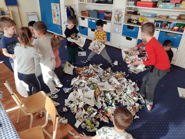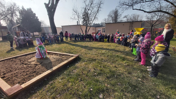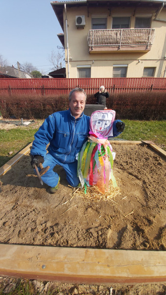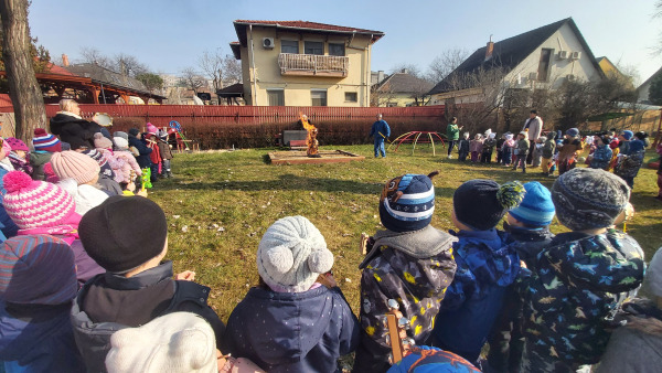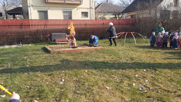 A Kék Delfin csoport gyermekei készítették el idén a kisze bábot, amit aztán az udvaron elégetve űztük el a telet és a hideget.