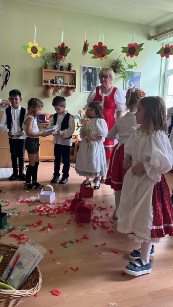 A táncok után felsorakoztak a középső csoportos gyermekek az óvónénikkel, és elmondták a búcsúztató verset, és átadták a kis meglepetéseket.