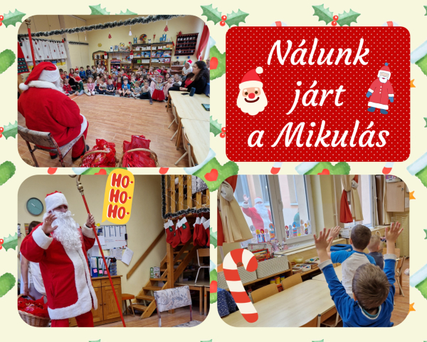 Mikulást várni minden éveben nagyon izgalmas dolog, így volt ez ebben az évben is. Az óvoda apraja és nagyja most is nagyon sokféleképpen készült, az érkezésére. Tanultak sok verset, dalt, rajzokkal üzentek, finomságot sütöttek. December 6-án, pénteken, a gyerekek alkalomhoz illő ruhákban, örömmel és persze izgalommal telve érkezetek reggel, hiszen ma jön a Mikulás! A délelőtt sok játékkal, dalolással, várakozással telt, a cipőcskék és csizmácskák kitisztítva várakoztak, hátha ajándék kerül bele, mikor egyszer csak zörögtek az ablakon. Megérkezett, akire hetek óta vártunk, itt van a kedves Mikulás, aki személyesen hozta el ajándékát. Nagy volt az öröm, volt, aki kicsit félénk volt, de sokan vidáman üdvözölték, megölelték és megköszönték az ajándékot, amivel meglepte őket. A csoportok örömmel mondták el a verseket és dalokat, amit a Mikulás látogatására tanultak.