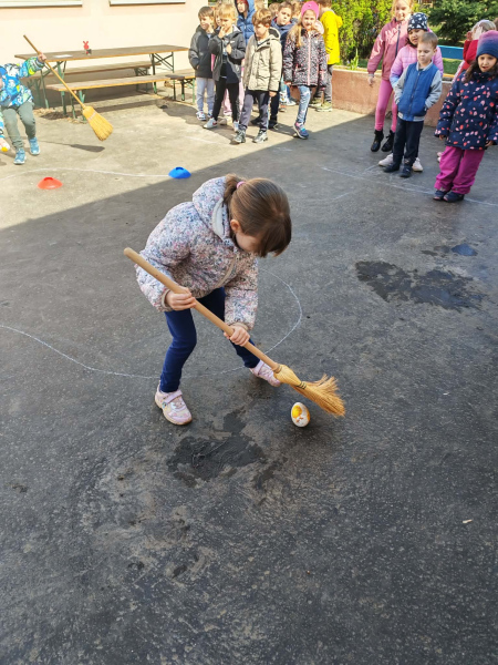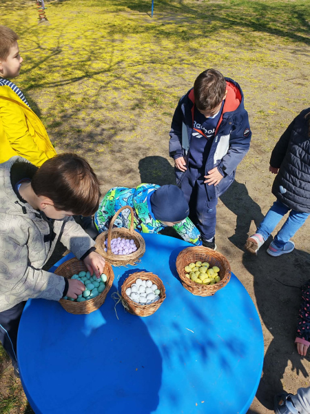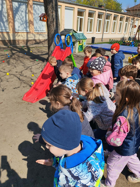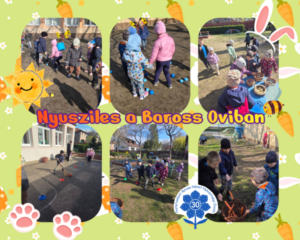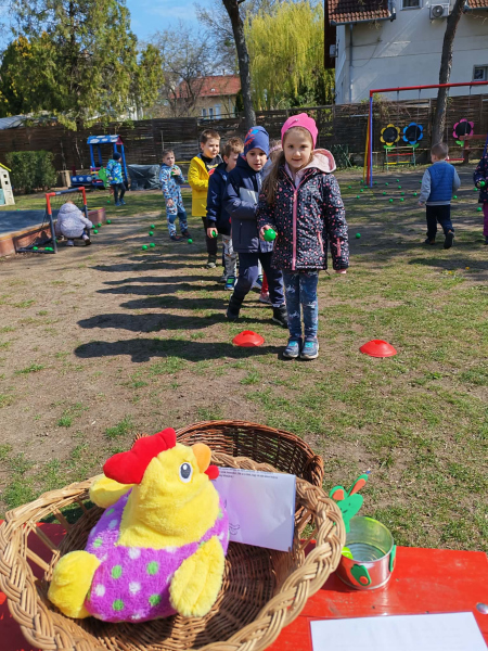Idén a csoportokban folyó tevékenységek mellé egy óvodai szintű program is kapcsolódott. Ennek „Nyusziles” lett a neve. A cím, a húsvéti nyúl esetleges felbukkanását, vagy nyomainak felfedezését takarja. „Nyuszi Juli” levelet írt a gyerekeknek, és a segítségüket kérte. Kérte, hogy a szétgurult, már megfestett tojásokat gyűjtsék össze, s ha esetleg ennivalót is találnak, azt is szedjék fel, mert nagyon éhes. Ez a kis mesekeret hívta játékba a gyerekeket az udvarra, ahol 6 állomáshelyen, változatos eszközökkel és feladatokkal találkozhattak. A legkisebbek külön helyszínen, életkoruknak megfelelő játékokban vehettek részt, miközben ők is Nyuszi Julinak segítettek. A játékos délelőttbe még az is belefért, hogy a csoportok a saját udvarukon keresgélve olyan tojást is találhattak, ami nem a nyuszié volt, hanem az övék lett.