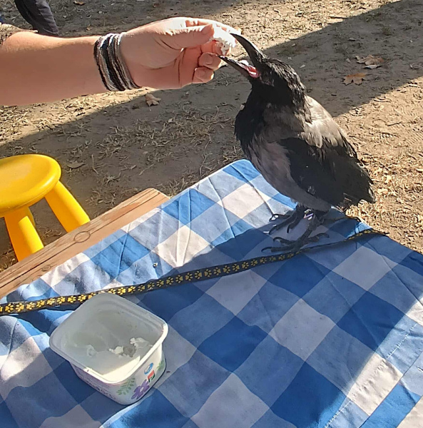 A „varjak és mi” és a „ReCrowery Varjúmenhely” által megtartott varjúsimogató előadást, a gyermekekkel már nagyon vártuk. Veres Dorottya és Gosztolai Adrienn, előadóink két, idei mentésű dolmányos varjúval érkeztek hozzánk: Vaculával és Gülükével. Fontos megjegyezni, hogy ezek a madarak nem idomítottak. Mindig a madár dönti el, hogy viszonyul az emberhez. Az ide bekerült madarak jól megvannak társaikkal is, de vannak közöttük, akik egész egyszerűen nem félnek és igénylik ezt a típusú figyelmet, ingert.